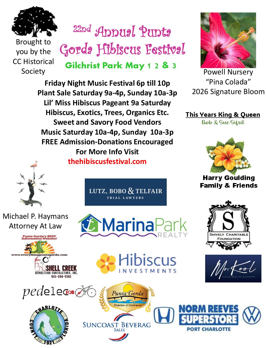 The 22nd Annual Punta Gorda Hibiscus Festival will be held at Gilchrist Park from May 1–3 and offers a full weekend of activities, plants, food, and entertainment.
